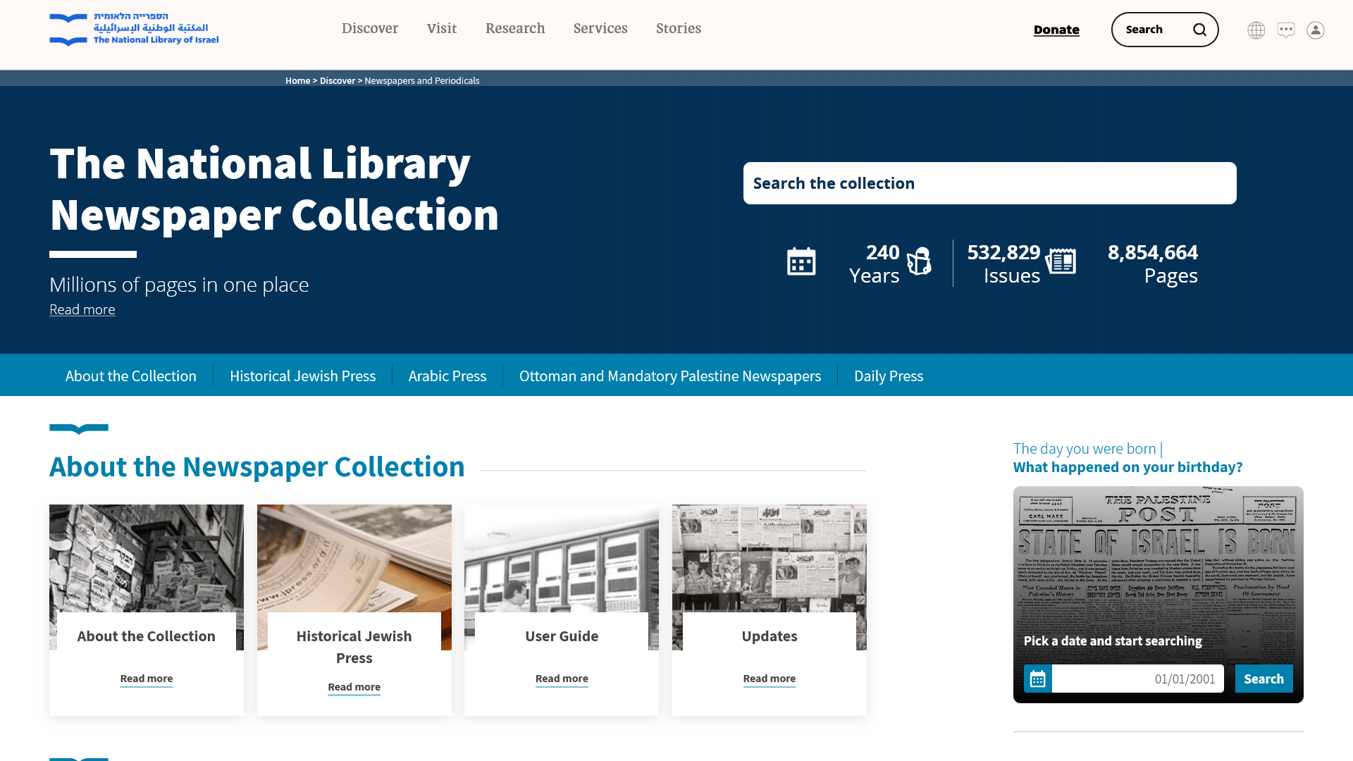 דף זה מציג את אוסף העיתונות הדיגיטלי של הספרייה הלאומית של ישראל, המהווה משאב חשוב ביותר לחקר ההיסטוריה היהודית והתרבותית. האתר מאפשר למבקרים לגשת לאוסף עצום של עיתונים היסטוריים באמצעות ממשק חיפוש מתקדם, כולל אפשרות לחפש לפי תאריך ספציפי או להכניס שמות אישיים. המטרה העיקרית של הפלטפורמה היא להנגיש לציבור הרחב את האוצרות העיתונאיים הנדירים שנאספו במשך עשרות שנים, ולאפשר מחקר מתקדם בתחומי ההיסטוריה, הסוציולוגיה והתרבות היהודית.