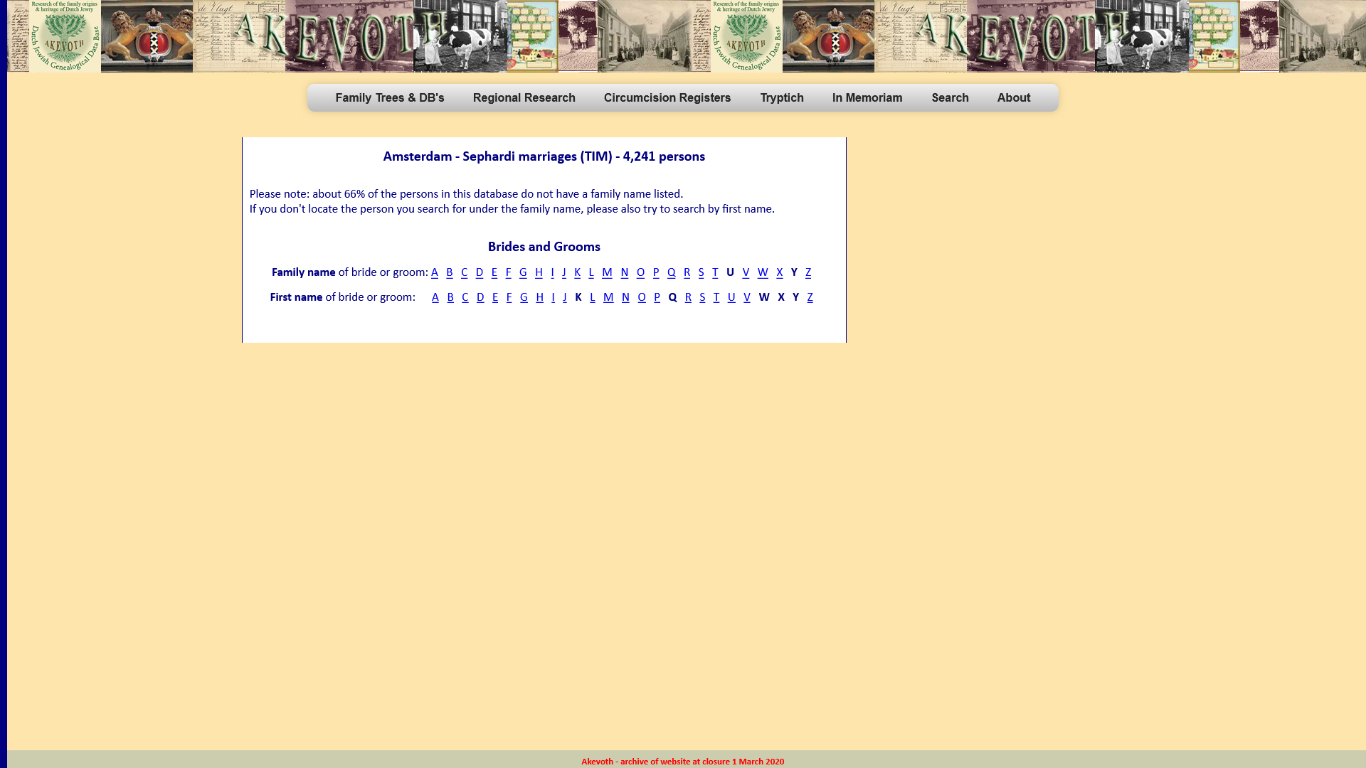 Importantly, this resource represents an archived collection, as indicated by the notation "Akevoth - archive of website at closure 1 March 2020." This suggests that while the database remains accessible, it is no longer actively maintained or updated, making it a fixed historical record rather than a growing collection. For researchers of Sephardic genealogy, Dutch Jewish history, or early modern European Jewish communities, this database represents a valuable snapshot of matrimonial patterns and naming conventions within Amsterdam's Sephardic community, though users must approach it with an understanding of its temporal limitations and the historical context of Jewish naming practices.